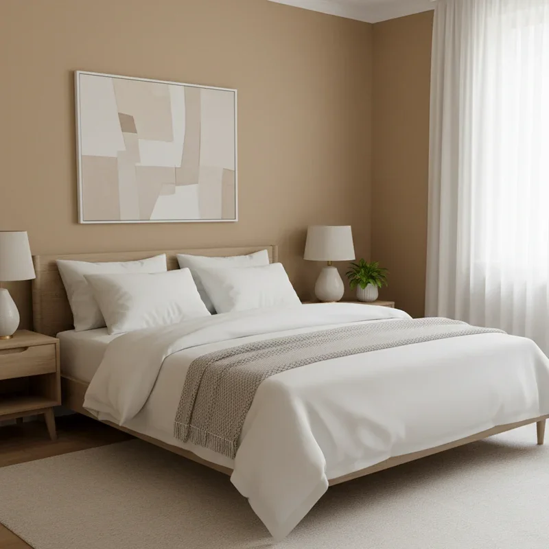 Create the perfect balance between warmth and freshness by painting your walls in soft tan and dressing your bed in pristine white linens. This classic combination feels like a luxury hotel suite, offering both comfort and sophistication that never goes out of style. The tan walls provide a cocoon-like atmosphere that promotes relaxation, while white bedding keeps things from feeling too heavy or closed in. It's amazing how white sheets and duvet covers pop against tan backgrounds, creating a focal point that draws you straight to bed. Add white furniture pieces like nightstands or a dresser to extend this fresh feeling throughout the room. This pairing works particularly well in bedrooms with limited natural light, as the white elements help bounce light around while the tan maintains warmth. Layer different white textures like cotton, linen, and knit for added visual interest.