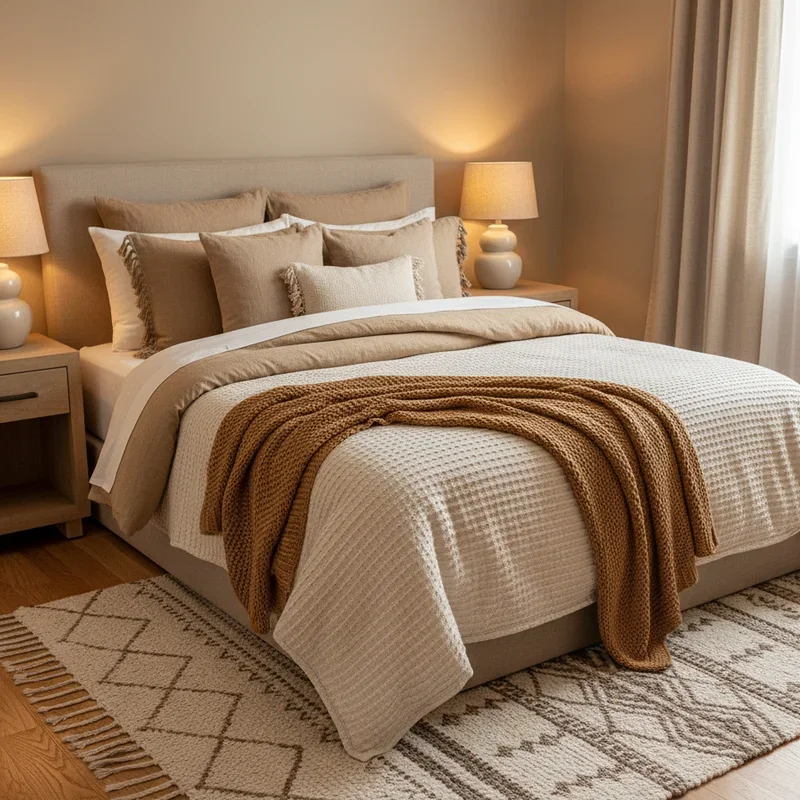 Transform your bed into an irresistible nest of comfort with textured tan bedding that invites touch and creates visual warmth simultaneously. Consider chunky knit blankets in caramel tones, linen duvet covers in sandy beige, or velvet throw pillows in rich toffee shades. These different textures catch light uniquely, adding dimension that flat fabrics simply can't achieve. Mixing textures within your tan palette prevents the space from feeling flat while maintaining that cohesive, calming atmosphere you're after. Think about incorporating waffle-weave blankets, cable-knit throws, or even faux fur accents in complementary tan shades. The beauty of textured bedding lies in its ability to make your bed look effortlessly styled yet incredibly inviting. Layer lighter textures for summer and heavier ones for winter, allowing your bedroom to evolve with the seasons while maintaining its tan foundation.