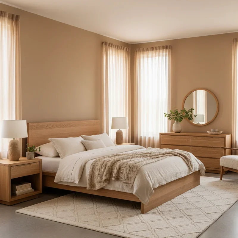 Nothing complements tan quite like the honest beauty of natural wood furniture that brings organic warmth and authentic character to your bedroom. Whether you choose light oak nightstands or a rich walnut bed frame, wood adds depth and texture that manufactured materials can't replicate. The grain patterns in wood create natural artwork that plays beautifully against solid tan walls or bedding. Consider mixing wood tones for a collected-over-time feel; perhaps a pine dresser paired with darker mahogany accent pieces. This combination grounds your tan palette in nature, creating a connection to the outdoors that promotes tranquility. Unfinished or lightly sealed wood maintains that raw, organic feel that works perfectly with tan's earthy vibe. Even small wooden elements like picture frames, jewelry boxes, or decorative bowls contribute to this natural harmony. Your bedroom becomes a warm sanctuary that feels both modern and timeless.