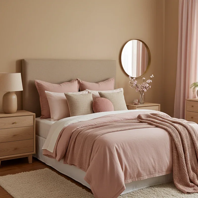 Introduce a touch of romance and unexpected sweetness by pairing your tan foundation with soft pink accents that feel modern rather than overly feminine. This combination works like sunset colors brought indoors, creating a dreamy atmosphere that's both sophisticated and comforting. Think blush pink throw pillows against tan bedding, or a dusty rose chair in the corner of your tan-walled bedroom. The warmth in both colors creates natural harmony while the contrast keeps things interesting. This pairing feels fresh and current, moving beyond traditional bedroom color schemes while maintaining broad appeal. Use pink sparingly as an accent rather than a co-star; perhaps through artwork, a single throw blanket, or fresh peonies in a vase. The key lies in choosing muted, sophisticated pinks rather than bright bubblegum shades. Your bedroom becomes a soft, dreamy retreat that feels both cozy and chic.