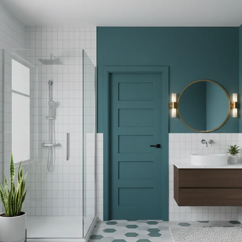 Your bathroom door offers an often-overlooked opportunity for style! Painting it teal creates a welcoming entry point that builds anticipation for the space beyond. This works especially well when your bathroom is visible from hallways or other rooms, as the pop of color adds interest to your entire home's flow. Choose a teal shade that complements your home's overall palette while giving your bathroom its own identity. Paint both sides of the door for consistency, or paint just the bathroom-facing side if you prefer neutral hallways. Update the door hardware to brass or gold for an elevated look. Consider painting the door frame in a contrasting color like white or cream to make the teal really stand out. This simple project takes just a few hours but makes a lasting impression.
