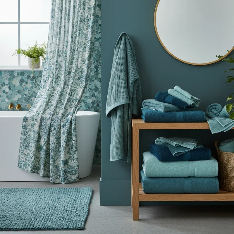 Soft textiles in teal shades add both comfort and style to your bathroom. Start with plush teal bath towels in various sizes, from washcloths to oversized bath sheets. Layer in a teal bath mat that feels luxurious underfoot. Add a teal shower curtain, window treatments, and even a small area rug if space allows. The beauty of textiles is their ability to be easily changed and washed, making them practical choices for bathrooms. Mix different textures like waffle weave, terry cloth, and linen for visual interest. Vary your teal shades slightly rather than matching everything exactly for a more curated, less contrived look. Stack rolled teal towels in open shelving or display them in a basket for a spa-like aesthetic. Quality textiles make your bathroom feel more luxurious and inviting.