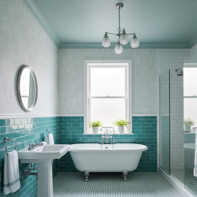 Want to surprise and delight everyone who enters your bathroom? Look up! A teal ceiling creates an unexpected element that transforms your space from ordinary to extraordinary. This bold choice works especially well in bathrooms with white or neutral walls, creating a beautiful contrast. The ceiling becomes like the sky in your personal sanctuary. Lighter teals give an airy, open feeling, while deeper teals create cozy, enveloping spaces. This technique particularly shines in bathrooms with architectural details like crown molding or ceiling medallions, which you can paint in contrasting white. Don't worry if your bathroom is small. A painted ceiling can actually make the space feel larger by drawing the eye upward and creating the illusion of height.