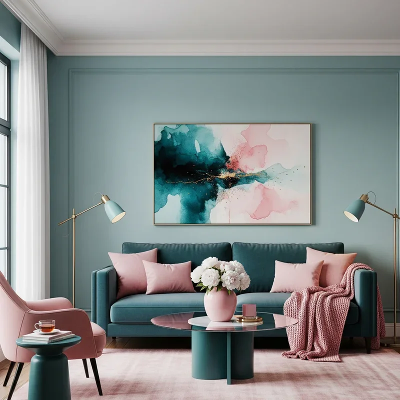 Embrace the unexpected elegance of teal paired with blush pink for a color combination that feels fresh and sophisticated! This pairing works because both colors contain complexity that prevents them from feeling juvenile or overly sweet. Blush pink pillows on teal sofas create gentle contrast that feels intentional yet soft. The combination suits various styles from bohemian to contemporary, proving its versatility. Balance the two colors carefully, using one as dominant and the other as accent for best results. Add metallic rose gold elements that bridge both colors beautifully while adding glamour. This palette feels particularly fresh in spring but maintains appeal year-round. The unexpected nature of this pairing makes living rooms feel unique and personally styled. Consider adding neutral elements like cream or gray to ground the color combination.