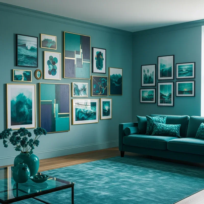 Transform blank walls into visual narratives with teal-dominant artwork that adds color while expressing personal style! Large abstract pieces featuring teal create instant focal points that anchor entire room designs. Gallery walls mixing teal-framed pieces with artwork containing teal elements build cohesive collections that feel curated rather than random. Photography of tropical waters or peacock feathers brings natural teal into your space authentically. The key lies in varying sizes and styles while maintaining teal as the connecting thread throughout. Consider mixing media types including paintings, prints, and textile art for dimensional interest. Position artwork at eye level for maximum impact, using lighting to highlight teal tones. This approach allows color introduction without painting or major furniture investments. Artwork offers flexibility to evolve your color story as pieces can be easily rotated or relocated.