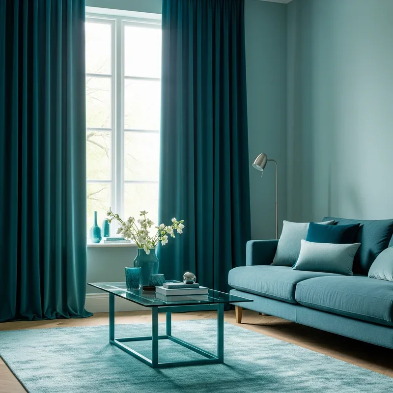 Frame your views and control natural light with teal window treatments that add vertical color while serving practical purposes! Floor-length teal curtains create dramatic columns of color that draw eyes upward, making ceilings appear higher. Choose heavier fabrics for room-darkening benefits or sheer teal panels that filter light into aqua-tinted ambiance. Roman shades in teal provide structured elegance perfect for formal living rooms, while relaxed linen curtains suit casual spaces. The beauty of window treatments lies in their ability to introduce significant color without overwhelming, as they can be drawn back to reveal neutral walls. Layer different teal tones through curtains and valances for sophisticated depth. Consider patterns that incorporate teal rather than solid colors for subtle integration. Window treatments offer seasonal flexibility, allowing heavier teals in winter and lighter aquas for summer.