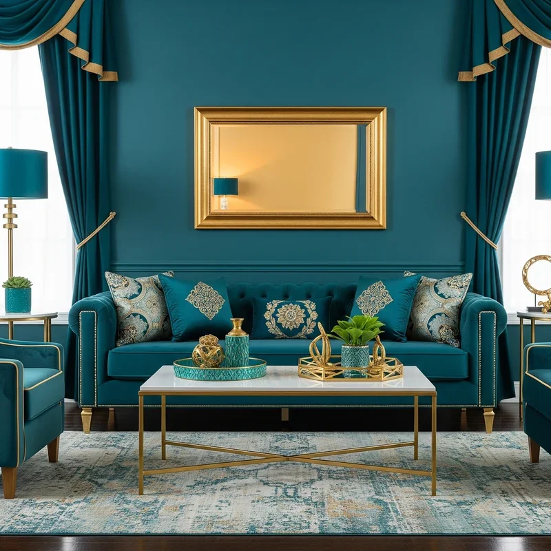Elevate your living room to five-star status by pairing teal with metallic gold accents that scream sophisticated luxury! This combination channels art deco glamour while feeling thoroughly modern, as gold's warmth perfectly complements teal's cool depth. Incorporate gold through picture frames, mirror edges, coffee table legs, or lamp bases that catch and reflect light beautifully. The key lies in balance; too much gold feels gaudy while too little gets lost against bold teal. Consider gold leaf details on teal furniture or gold-framed artwork featuring teal elements for cohesive design. Brass fixtures work as gold alternatives, offering similar warmth with more subtle presence. This pairing works across design styles, from modern minimalist to traditional maximalist approaches. The combination creates spaces that feel expensive and thoughtfully curated without requiring actual luxury budgets.