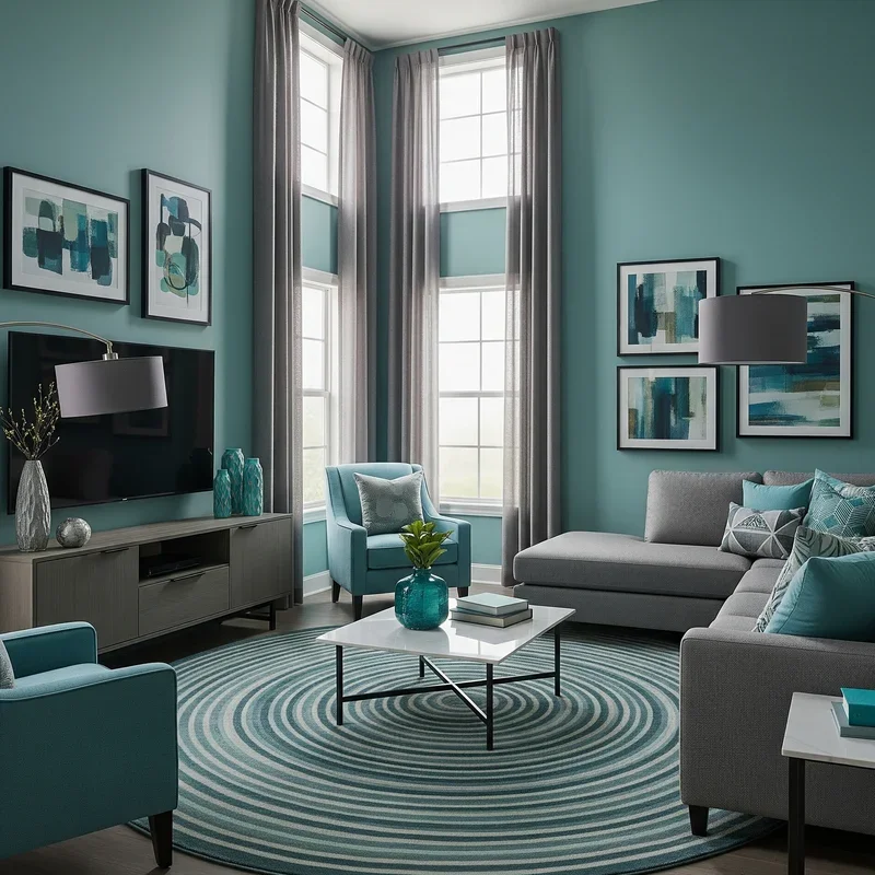 Create sophisticated balance by combining teal with various gray tones that temper vibrancy while maintaining visual interest! This pairing works because gray grounds teal's energy, creating spaces that feel both lively and serene. Light gray walls provide perfect backdrops for teal furniture and accessories to pop without overwhelming. Charcoal gray sofas paired with teal pillows offer reverse contrast that feels fresh and modern. The combination suits various design styles, from industrial chic to contemporary elegance. Add white elements to prevent the palette from feeling too heavy or moody. Consider gradient transitions where teal fades into gray through ombre techniques or carefully selected accessories. This color combination proves particularly effective in rooms that serve multiple purposes, as it adapts from energetic daytime to calm evening atmospheres. Mixed metals in silver and pewter naturally complement this sophisticated color story.
