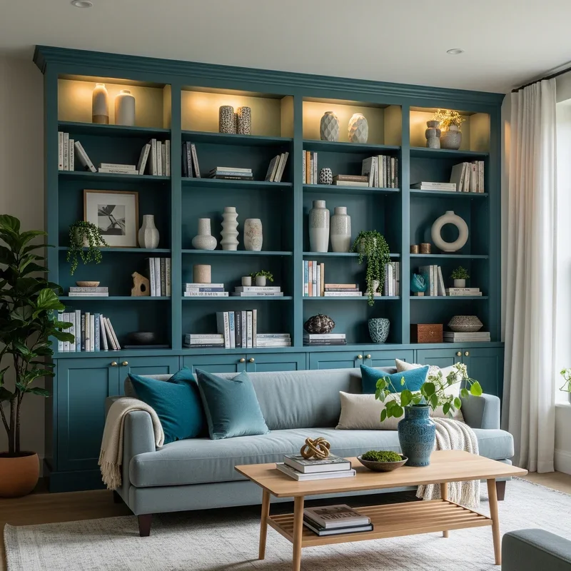 Transform functional storage into artistic statements with teal-painted built-in shelving that adds architectural interest! Painting the backs of shelving units teal creates depth while displayed items pop against the colored backdrop. Full teal built-ins become room-defining features that provide both storage and significant color impact. The permanence of built-ins makes them perfect for confident color choices that define room character. Style shelves with coordinating accessories that complement rather than compete with teal backgrounds. Books, ceramics, and decorative objects become part of the color story when thoughtfully arranged. Consider gradient painting techniques where teal intensity varies across shelving sections. This approach works particularly well in rooms with limited wall space for artwork. Built-in shelving painted teal proves that functional elements can be beautiful design features.