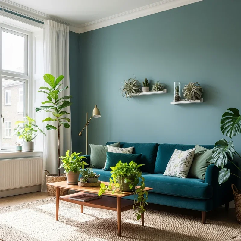 Combine teal with lush greenery to create living rooms that feel like sophisticated garden rooms! The natural affinity between teal and plant life stems from teal's green undertones that complement foliage beautifully. Teal planters elevate simple houseplants into decorative statements that bring life and color simultaneously. Large tropical plants against teal walls create Instagram-worthy vignettes that feel effortlessly styled. The combination works because both elements connect to nature, making spaces feel organic rather than decorated. Consider botanical prints featuring teal backgrounds or frames that merge both elements artistically. Living walls or vertical gardens against teal backdrops create stunning focal points. This pairing brings outdoors in while maintaining sophisticated color control. The key lies in choosing plants with interesting leaf shapes that create shadows and movement against teal surfaces.