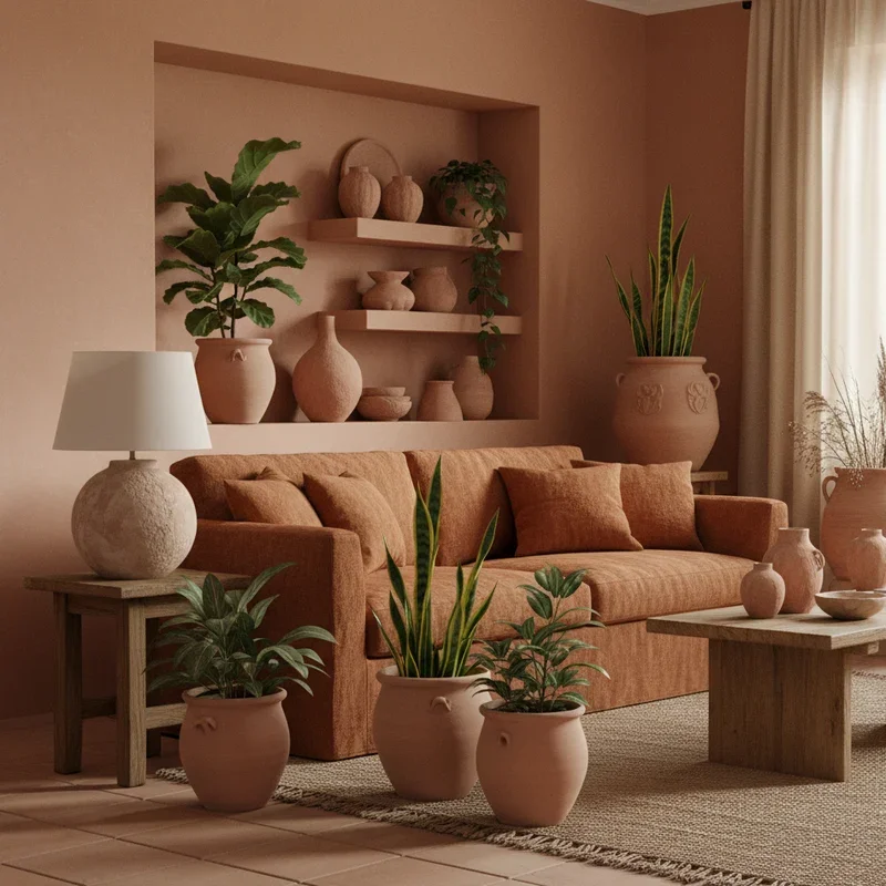Nothing brings life to a living room quite like plants in beautiful terracotta pots. These classic containers have been housing greenery for centuries, and there's good reason why. The porous nature of terracotta helps regulate soil moisture, keeping your plants happy while adding organic beauty to your space. Group pots of varying sizes for visual impact, mixing traditional terracotta with glazed versions in complementary colors. Beyond plant containers, decorative ceramics in terracotta tones serve as sculptural elements. Think oversized vases, decorative bowls, or artistic pottery pieces displayed on shelves or coffee tables. These elements add texture and warmth without overwhelming your color palette. The handmade quality of many terracotta pieces brings authenticity and character that mass-produced decor simply can't match. Your living room becomes a celebration of natural materials and artisan craftsmanship.