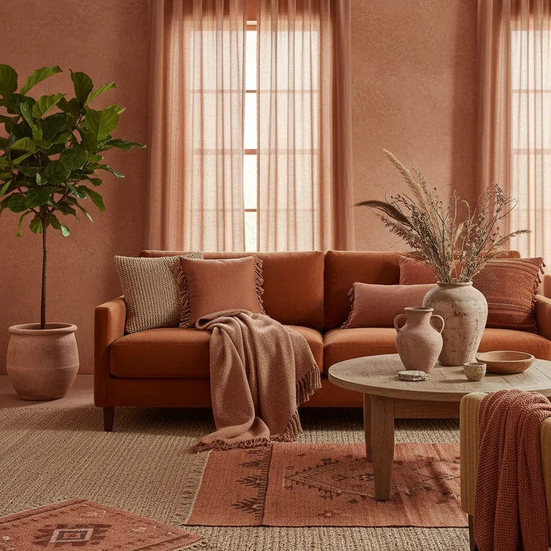 A: Use textiles, artwork, furniture, and decorative accessories in terracotta tones.