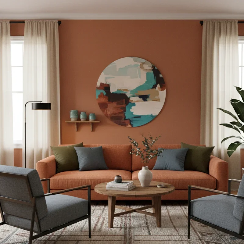 Art lovers, rejoice! Terracotta doesn't have to come from a paint can to make an impact. Large-scale artwork featuring terracotta tones can anchor your living room design beautifully. Think abstract pieces with sweeping terracotta brushstrokes, landscape photography capturing desert scenes, or geometric prints in warm earth tones. Gallery walls mixing terracotta-framed pieces with complementary artworks create visual interest without overwhelming the space. Don't overlook three-dimensional wall art like terracotta wall hangings, sculptural pieces, or even a collection of terracotta plates arranged artistically. Mirrors with terracotta-toned frames reflect light while adding warmth, making your space feel larger and brighter. The best part? You can easily swap out artwork to refresh your space without major renovations, keeping your living room dynamic and personally meaningful.