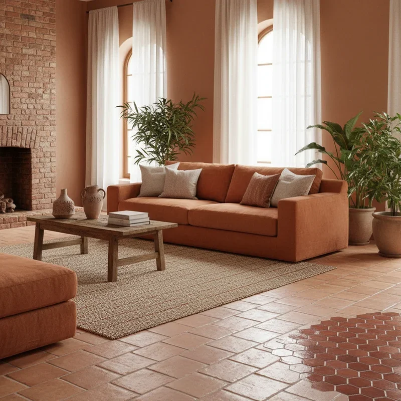 Flooring sets the foundation for your entire design scheme, and terracotta tiles bring instant character to any living room. Whether you choose traditional hexagonal tiles, large format squares, or patterned designs, terracotta flooring adds warmth from the ground up. These tiles work beautifully with underfloor heating, making winter evenings extra cozy. Not ready for a full floor renovation? Consider a terracotta tile hearth around your fireplace or a tiled accent area that defines your seating zone. The natural variation in terracotta tiles means no two are exactly alike, adding authentic charm that manufactured materials can't replicate. Pair them with large area rugs to define spaces and add softness underfoot. The durability of terracotta tiles means they'll age beautifully, developing a patina that only adds to their appeal over time.