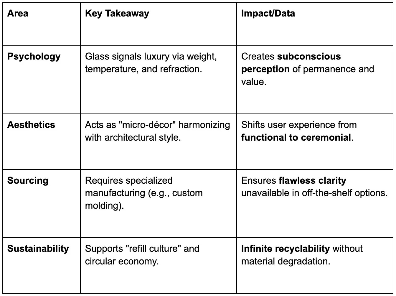 Tactile Weight: Glass possesses a density that implies value. When a guest picks up a heavy glass dispenser, the weight signals permanence and quality.