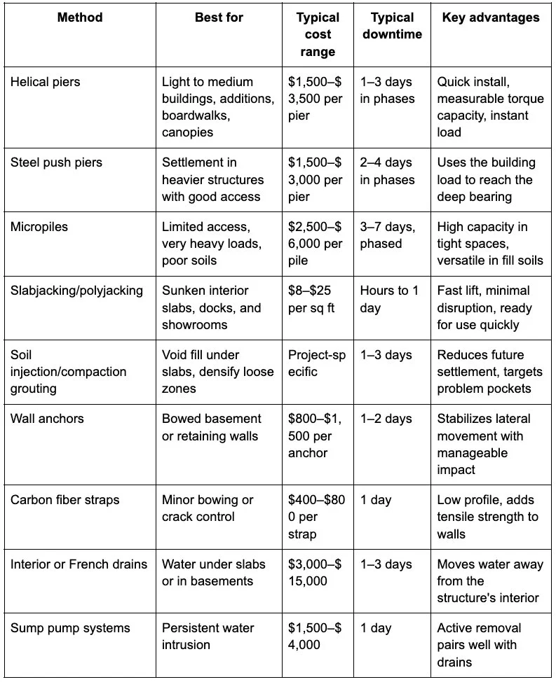 - Proven methods like helical piers, micropiles, and slab lifts.