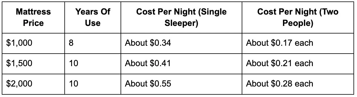 People sometimes hesitate to invest in a better mattress because it feels like a big one time cost. But break it down. A bed that costs more upfront and lasts ten years works out to pennies a day.