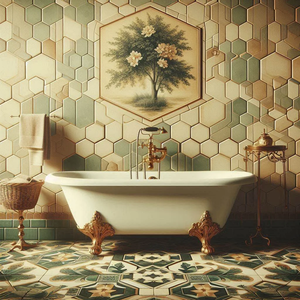 Flooring plays a crucial role in creating a vintage aesthetic, and hexagon tiles are the perfect choice to achieve that classic look. Often found in black-and-white patterns, these small tiles bring a retro charm that’s both stylish and practical. Popular in early 20th-century bathrooms, hexagon tiles add timeless elegance and make a bold statement, whether used in their traditional monochrome form or with a modern twist. To enhance the vintage vibe, pair hexagon floor tiles with subway tiles on the walls for a cohesive and unified design. This combination creates a clean, timeless look that evokes the charm of old-world bathrooms while remaining functional and fresh for today’s spaces.