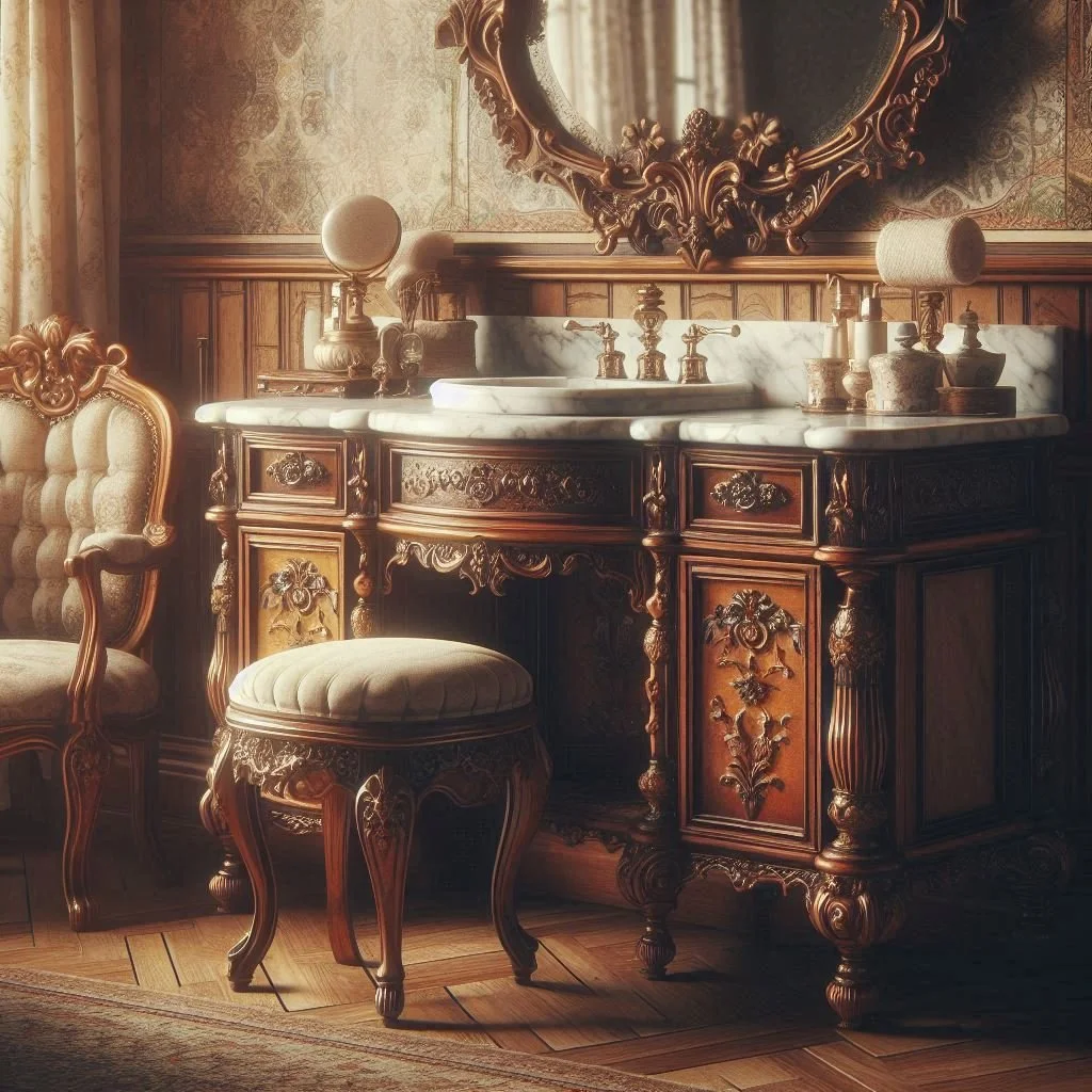 For a true vintage bathroom experience, an antique vanity with a marble countertop is the perfect choice. This timeless combination not only brings elegance but also offers durability, with the smooth, cool marble surface adding a touch of luxury. The rich texture of marble pairs beautifully with the wood details of an antique vanity, creating a piece that feels both classic and sophisticated. Look for vanities with intricate carvings or distressed finishes to enhance the authenticity, giving your bathroom an old-world charm. The blend of these materials creates a stunning focal point, infusing your space with a sense of history and refinement while maintaining modern functionality.