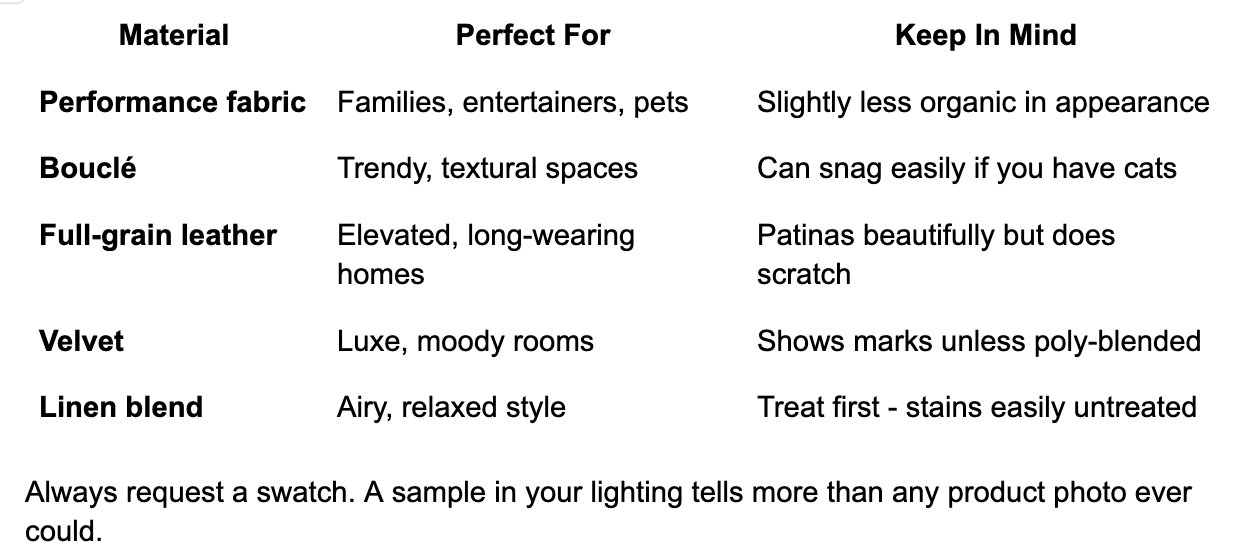Fabric or leather isn’t just a surface. It determines the mood, the longevity, and the lifestyle fit. Choose based not just on touch, but on how you'll use it.Always request a swatch. A sample in your lighting tells more than any product photo ever could.