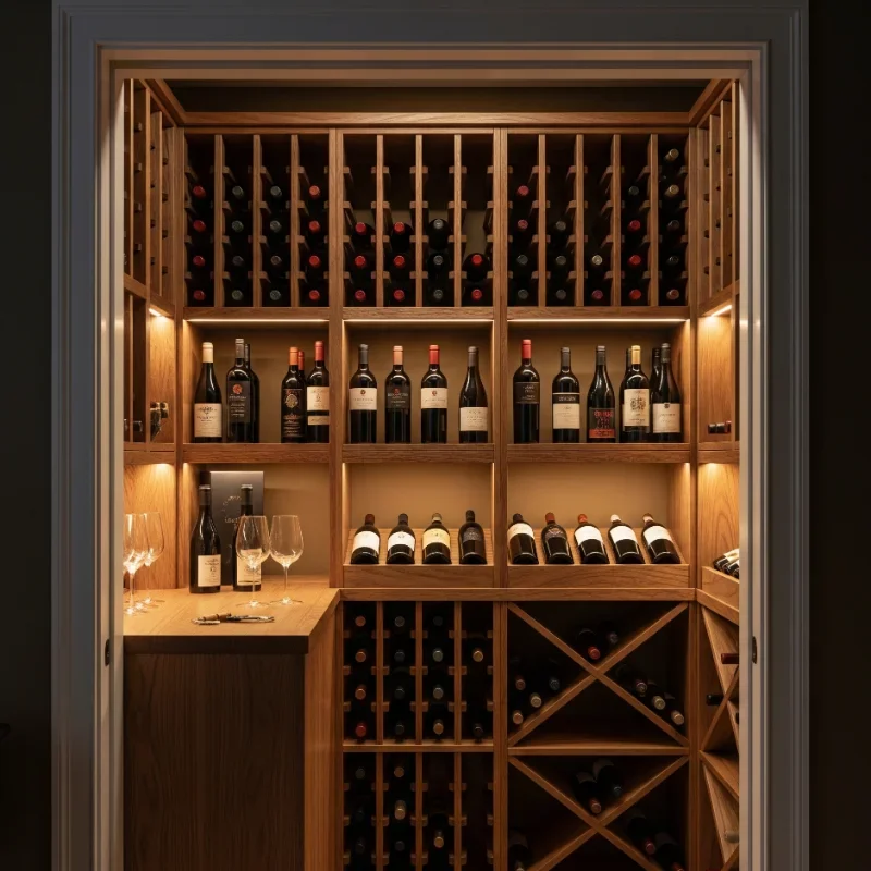 25-square-foot closet can hold 500+ bottles with efficient racking and smart design choices.