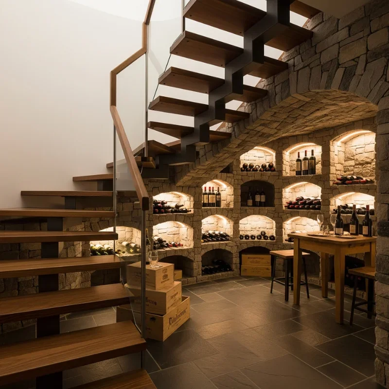 Unlock the potential of that awkward under-stair space by creating a dramatic wine cave that maximizes every angle! This often-overlooked area provides natural insulation and protection from light, making it ideal for wine storage. Custom racking follows the staircase angle, creating a cascading display that draws the eye upward. Install a decorative iron gate or glass door to showcase your collection while maintaining climate control. The triangular space naturally creates different zones for various wine types or regions. Add stone veneer or exposed brick to enhance the cave-like atmosphere. Subtle uplighting emphasizes the architectural angles while making bottle selection easier. Include a pull-out tasting shelf that tucks away when not in use. The slanted ceiling adds character that rectangular rooms can't match. This creative solution turns dead space into your home's most interesting feature. Your guests will never look at staircases the same way again!