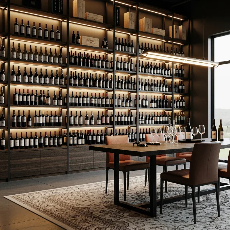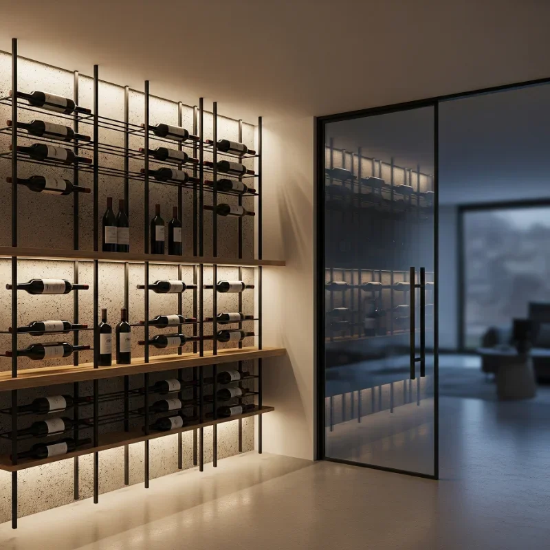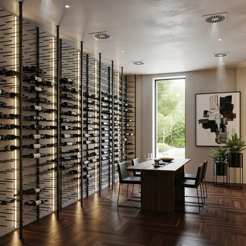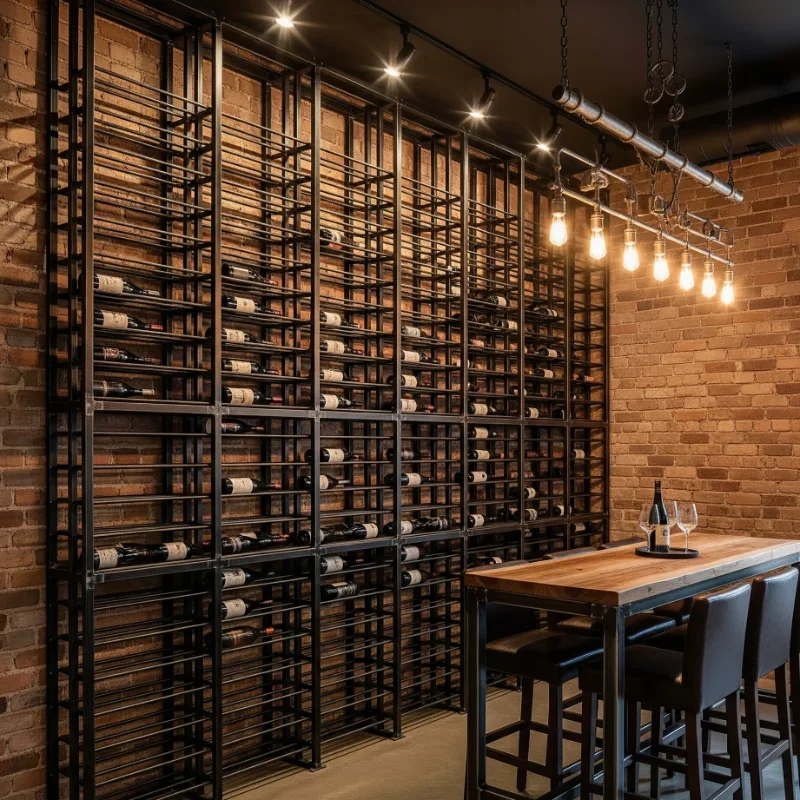 Embrace industrial chic with modern metal racking systems that combine minimalist aesthetics with maximum functionality! These modular systems use materials like brushed steel, black iron, or copper-toned aluminum to create striking geometric patterns. Wall-mounted designs float bottles in air, creating an illusion of weightlessness that suits contemporary homes perfectly. The metal construction provides superior strength for large collections while maintaining a light, airy appearance. Choose from peg systems, cable displays, or magnetic holders that accommodate various bottle sizes and shapes. The industrial materials naturally regulate temperature, staying cool to the touch while supporting precious vintages. Mix metals for added visual interest or stick to one finish for cohesive sophistication. These systems easily expand as your collection grows, simply adding modules as needed. The clean lines complement modern architecture without overwhelming the space. Metal racking proves that wine storage can be both an engineering marvel and artistic statement.