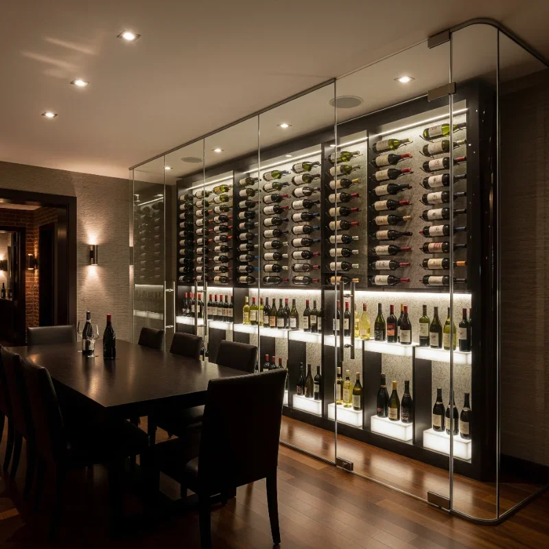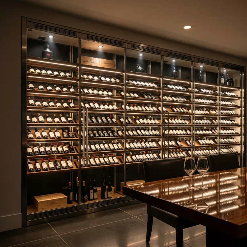 Make a bold statement with a climate-controlled wine wall that turns an entire wall into functional art! These built-in systems span floor to ceiling, creating a dramatic backdrop for dining or living areas. Individual temperature zones allow simultaneous storage of reds, whites, and champagnes at their ideal temperatures. The shallow depth works perfectly in narrow spaces like hallways or dining room walls. Choose from various display angles, from horizontal showcase positions to traditional vertical storage. Integrated cooling systems maintain consistent conditions without visible equipment cluttering your design. Add custom millwork frames to match your home's architecture, from sleek modern to ornate traditional. Include pull-out shelves for easy access to bottles stored higher up. This solution maximizes storage in homes without dedicated cellar space. The wine wall becomes a living piece of art that evolves with your collection. Your wines remain perfectly preserved while staying beautifully visible and easily accessible.