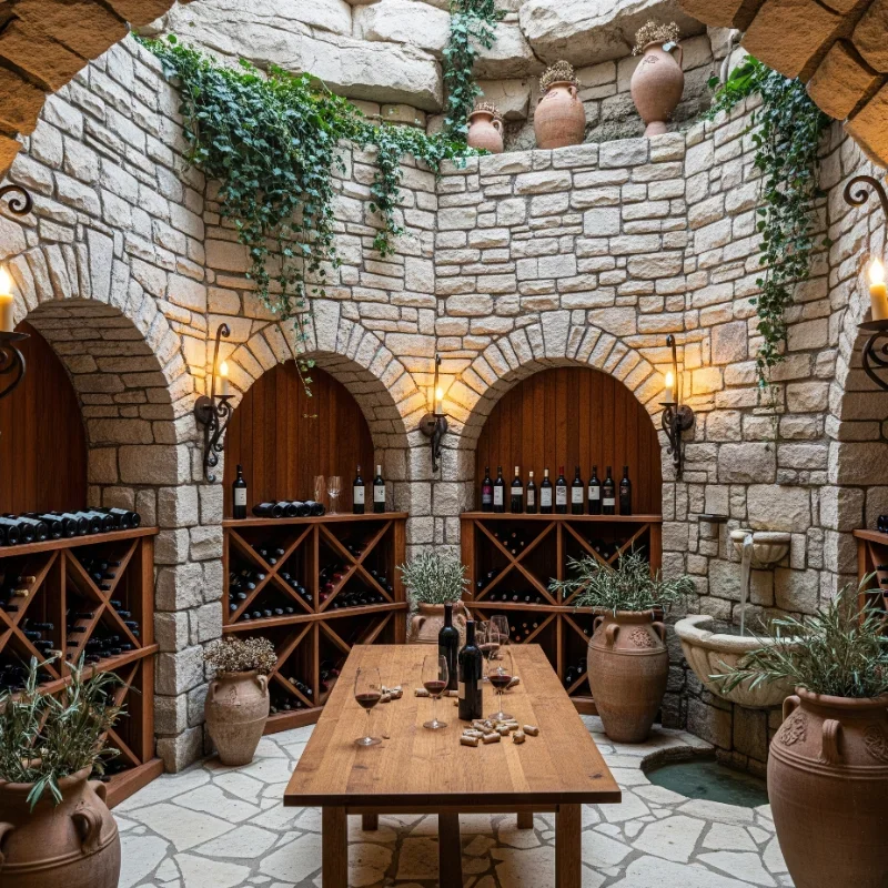 Create a sun-drenched Mediterranean escape with a wine grotto that channels coastal European charm! Use warm materials like honey-colored limestone, terracotta tiles, and weathered wood beams to evoke seaside wine bars. Incorporate architectural elements like Moorish arches, decorative tilework, and wrought iron details that transport you to the Amalfi Coast. Natural textures and earthy colors create a warm, inviting atmosphere that encourages lingering. Include a small water feature for ambient sound and humidity control that enhances the Mediterranean ambiance. Display pottery, olive jars, and rustic accessories that complement the regional theme. The design philosophy embraces imperfection, with hand-plastered walls and artisan tiles adding authentic character. Install French doors or large windows if possible, connecting your grotto to outdoor spaces. This style celebrates the joy and social aspects of wine culture rather than formal collecting. Your wine room becomes a vacation destination without leaving home.