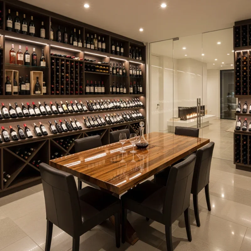 Create the ultimate entertainment space by incorporating a dedicated tasting area within your wine room! A central table, whether rustic farmhouse or sleek modern, becomes the heart of wine appreciation and social gathering. Include comfortable seating for intimate tastings or larger gatherings, making your cellar a destination rather than just storage. Built-in cabinetry holds glassware, decanters, and tasting accessories, keeping everything within reach. Add a small sink for rinsing glasses and a wine refrigerator for bottles ready to serve. The tasting area encourages you to actually enjoy your collection rather than just admiring it. Install adjustable lighting to properly evaluate wine color and clarity during tastings. Include a cheese refrigerator or charcuterie storage for perfect pairings. This multi-functional approach transforms your wine room into a private tasting room rivaling commercial establishments. The combination of storage and entertainment space justifies the room's footprint while maximizing enjoyment.