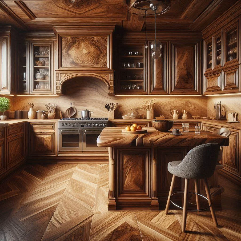 Maple wood, known for its smooth grain and light color, is an excellent choice for creating a modern kitchen with a sleek, minimalist feel. Its subtle, understated look enhances clean lines and blends effortlessly with simple hardware, offering a sophisticated yet unpretentious vibe. Maple cabinets provide a neutral canvas that pairs well with various countertop materials, such as quartz or granite, allowing for flexibility in design while keeping the space feeling airy and bright. This wood’s durability means it holds up beautifully over time, resisting wear and tear, making it ideal for busy kitchens. Whether you prefer a natural finish or a light stain, maple wood brings elegance and warmth, achieving a timeless look in any modern kitchen.