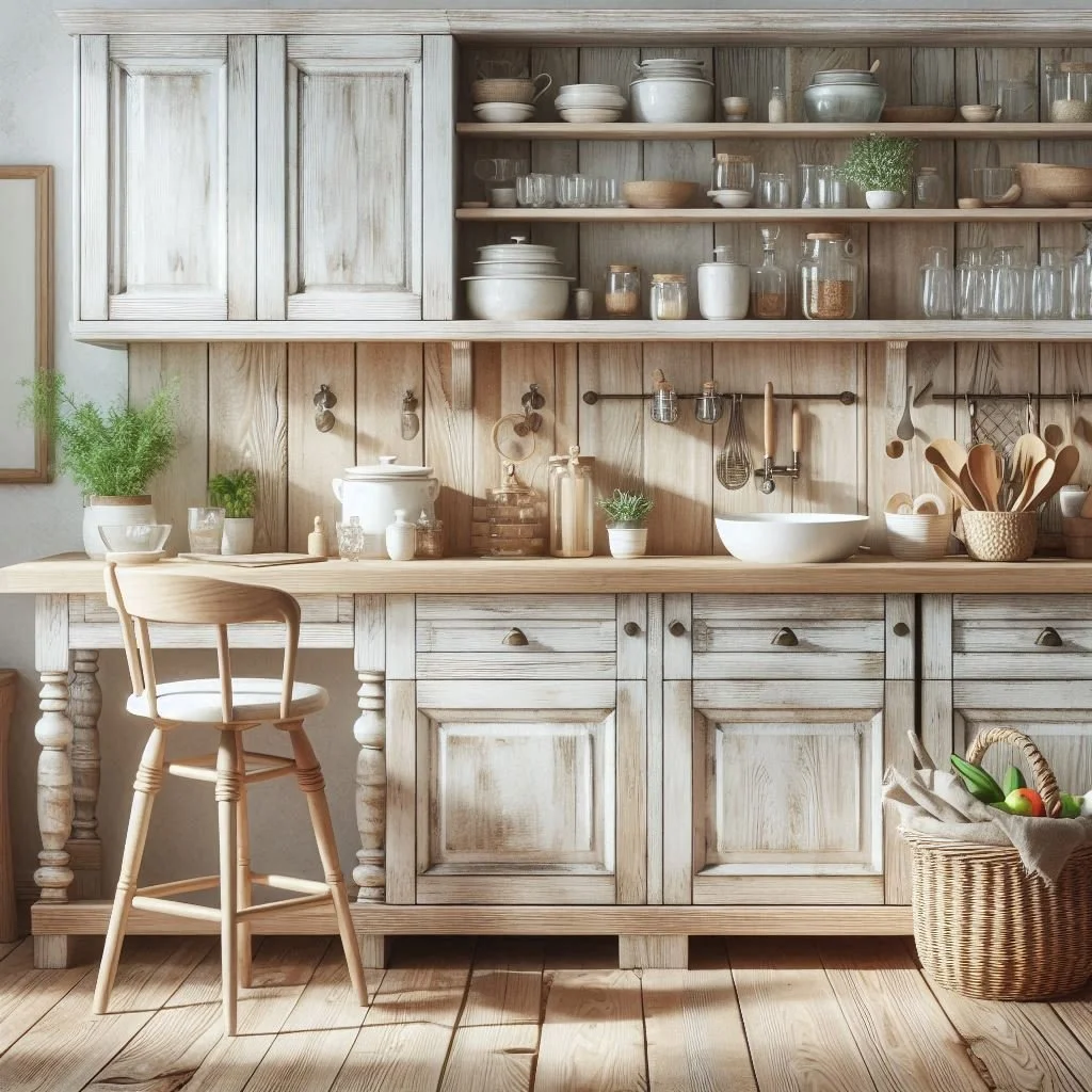 Whitewashed wood cabinets are a beautiful choice for anyone wanting to infuse their kitchen with a light, coastal ambiance. The soft, faded finish brings a touch of the beach indoors, ideal for creating a relaxing, breezy atmosphere. This style is particularly effective in small kitchens, as the pale tones help to reflect light, making the space feel open and inviting. Whitewashed wood pairs seamlessly with natural materials like stone countertops or rattan accents, adding to the laid-back, seaside vibe. It’s an ideal look for those who crave a fresh, tranquil space reminiscent of sandy shores and ocean breezes, turning your kitchen into a calming retreat that’s as stylish as it is welcoming.