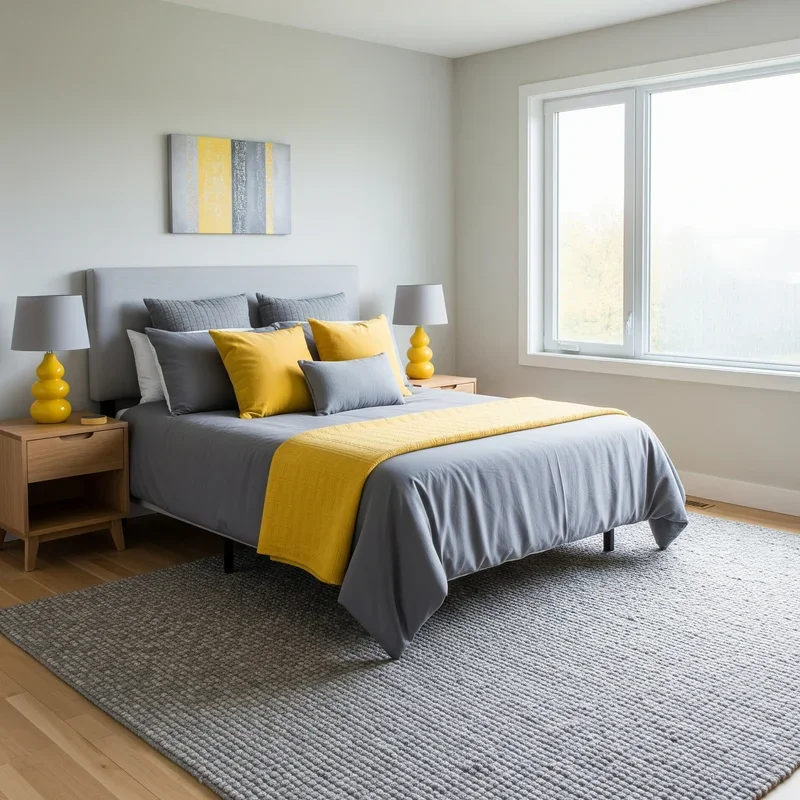 A: Gray, white, navy, green, and natural wood tones all complement yellow beautifully in bedroom settings.