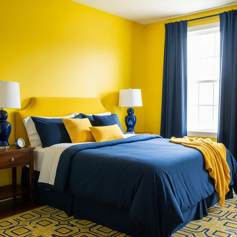 Discover the nautical-inspired elegance of combining yellow with rich navy blue for a bedroom that feels both classic and fresh! This high-contrast pairing creates visual interest while maintaining a sophisticated, pulled-together appearance. Use navy as your grounding color through furniture or feature walls, then add yellow through accessories and textiles. The deep blue prevents yellow from feeling too juvenile while yellow keeps navy from becoming too serious. Add white elements to brighten the palette and create breathing room between these strong colors. This combination works brilliantly with brass or gold hardware that bridges the warm and cool tones. Include patterns like stripes or geometric prints that incorporate both colors for cohesive design. Your bedroom achieves that perfect balance of energy and calm, sunshine and sea.
