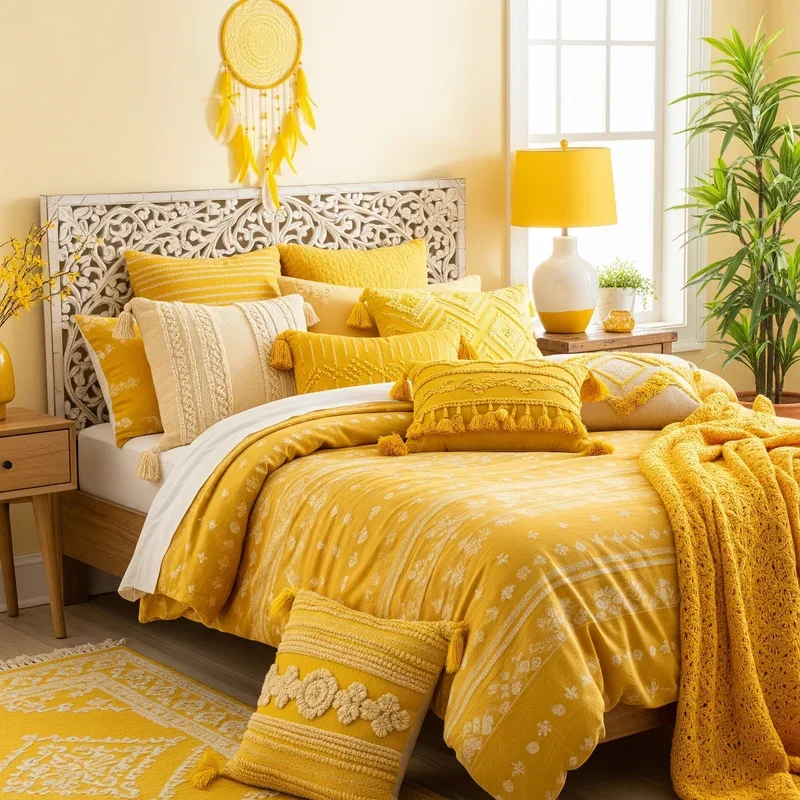 Layer your bedroom with bohemian-inspired yellow textiles that create a globally-inspired, eclectic paradise! Think macramé wall hangings with yellow details, mustard throw pillows with tassels, and golden yellow tapestries. Mix different textures like woven blankets, embroidered cushions, and fringed throws in various yellow tones. The key to boho style is abundance without chaos, so vary your yellows from pale to deep. Add natural materials like rattan and wood to ground the yellow and prevent it from overwhelming. This approach lets you incorporate yellow gradually through accessories that can change with seasons or moods. Include plants whose green leaves create perfect contrast with yellow textiles. Your bedroom becomes a cozy nest that feels collected from travels around the world.