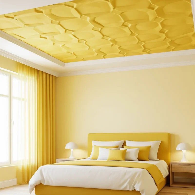 Surprise and delight by painting your ceiling yellow while keeping walls neutral for an unexpected twist! This fifth wall treatment draws eyes upward, making rooms feel taller and more spacious instantly. A yellow ceiling acts like permanent sunshine, brightening the entire room without overwhelming vertical surfaces. Choose a soft yellow for subtle warmth or go bold with a deeper shade for dramatic impact. This technique works especially well in bedrooms with interesting ceiling details like beams or crown molding. The yellow above creates a cozy canopy effect that makes bedtime feel special and mornings more cheerful. Pair with a stunning light fixture that complements the yellow for a cohesive look. Your ceiling becomes a piece of art you can appreciate while lying in bed.