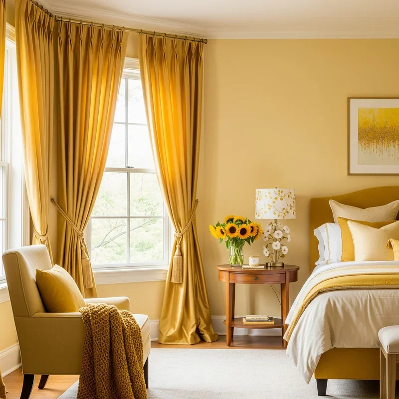 Frame your windows with golden yellow curtains that filter sunlight into pure liquid gold throughout your bedroom! These window treatments do double duty, providing privacy while amplifying natural light in the most flattering way. Choose sheer yellow curtains for a ethereal, dreamy effect or heavier fabrics for better light control and insulation. The golden tone adds warmth without being as bold as brighter yellows, making it perfect for hesitant decorators. Layer them with white sheers or blinds for versatile light filtering options throughout the day. The vertical lines of floor-length yellow curtains draw eyes upward, making ceilings appear higher and rooms feel larger. They create a soft, diffused glow that makes everyone look better, like having a permanent Instagram filter for your bedroom. This single change can completely alter your room's ambiance from cold to cozy.