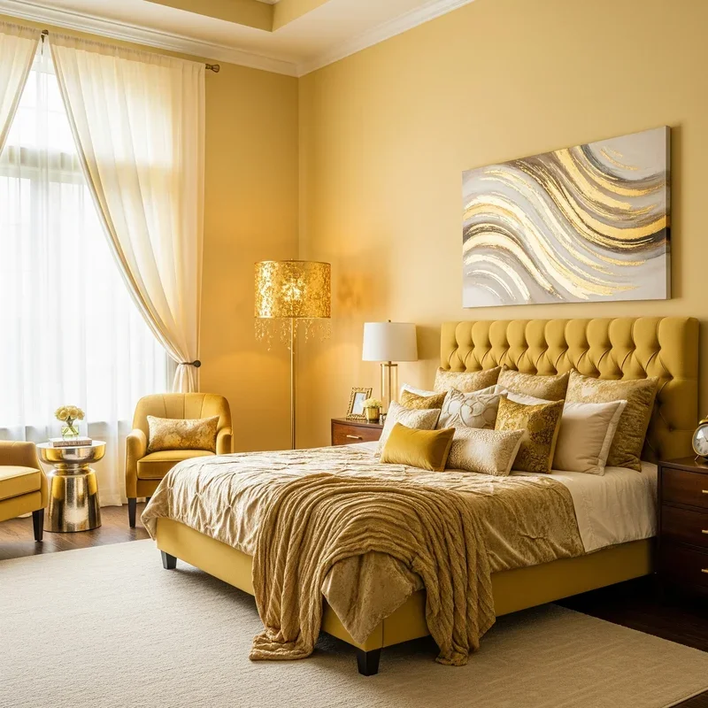 Elevate your yellow bedroom with strategic metallic gold accents that add glamour and sophistication! Gold hardware on furniture, mirror frames, and light fixtures creates cohesion while adding luxury touches. The metallic finish reflects light differently than matte yellow, creating depth and visual interest throughout the room. Use gold sparingly to avoid overwhelming; think quality over quantity for maximum impact. Mix gold finishes from brushed to polished for a collected, layered look that feels intentional. This approach works particularly well with deeper yellows like mustard or ochre that share gold's warmth. Include gold in unexpected places like curtain rods or drawer pulls for cohesive design. Your bedroom gains an elevated feel that proves yellow can be both cheerful and chic.