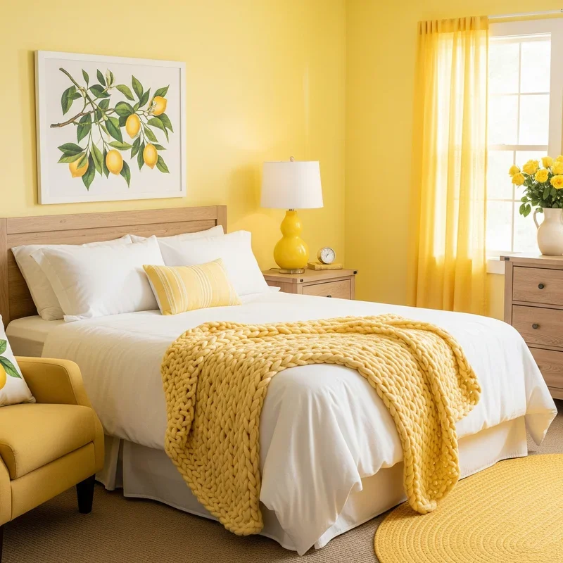Punch up a neutral bedroom with strategic pops of bright lemon yellow through carefully chosen accessories! Add yellow table lamps, picture frames, vases, or decorative objects that inject personality without permanent commitment. This approach perfect for renters or those hesitant about bold color choices on larger surfaces. Cluster yellow accessories for impact or spread them throughout for a cohesive thread that ties the room together. The bright lemon shade energizes without overwhelming, especially when balanced with plenty of white space. Switch out accessories seasonally or when you crave change without major renovation. Include functional yellow items like alarm clocks or jewelry boxes that serve purpose while adding color. Your bedroom gains personality through these small but mighty additions that prove sometimes less really is more.