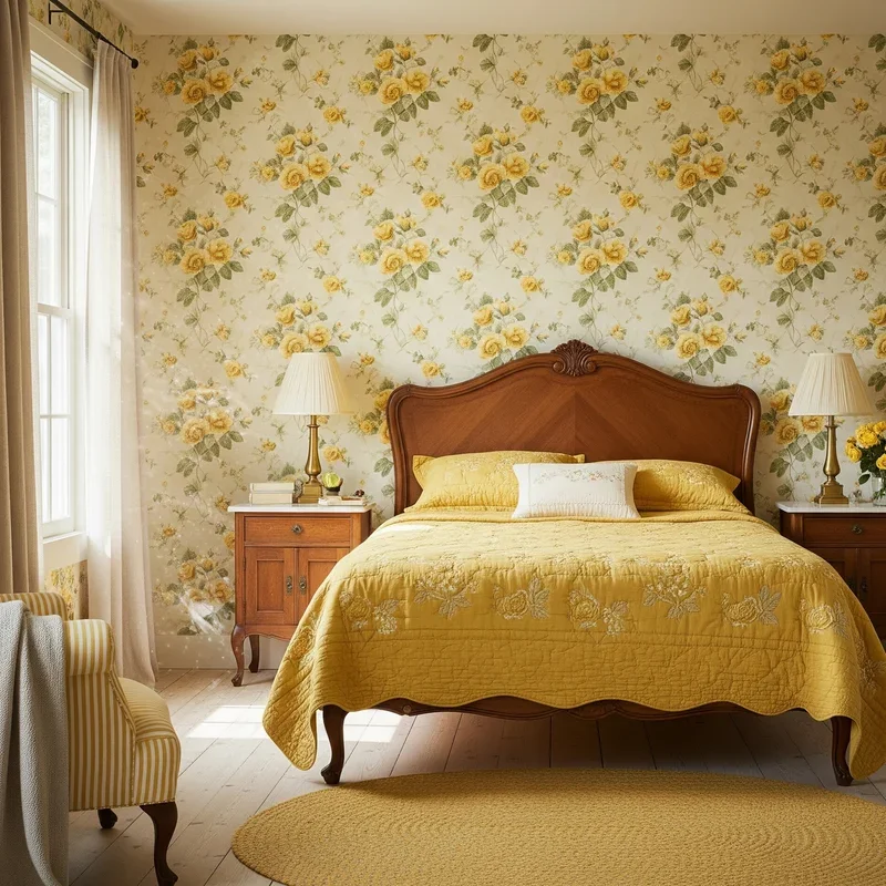 Embrace romantic nostalgia with vintage-inspired yellow floral patterns that bring timeless charm to your bedroom! Whether through wallpaper, bedding, or upholstery, yellow florals add personality without feeling overwhelming. Choose large-scale blooms for drama or delicate patterns for subtle sweetness that whispers rather than shouts. Mix different floral scales and styles to avoid looking too matchy-matchy or like grandma's guest room. The organic nature of florals softens yellow's intensity while maintaining its cheerful essence. This style pairs beautifully with antique furniture and vintage finds for a collected-over-time feel. Add solid yellow accents to tie the floral patterns together and create visual cohesion. Your bedroom becomes a secret garden where yellow blooms never fade and spring lives eternal.