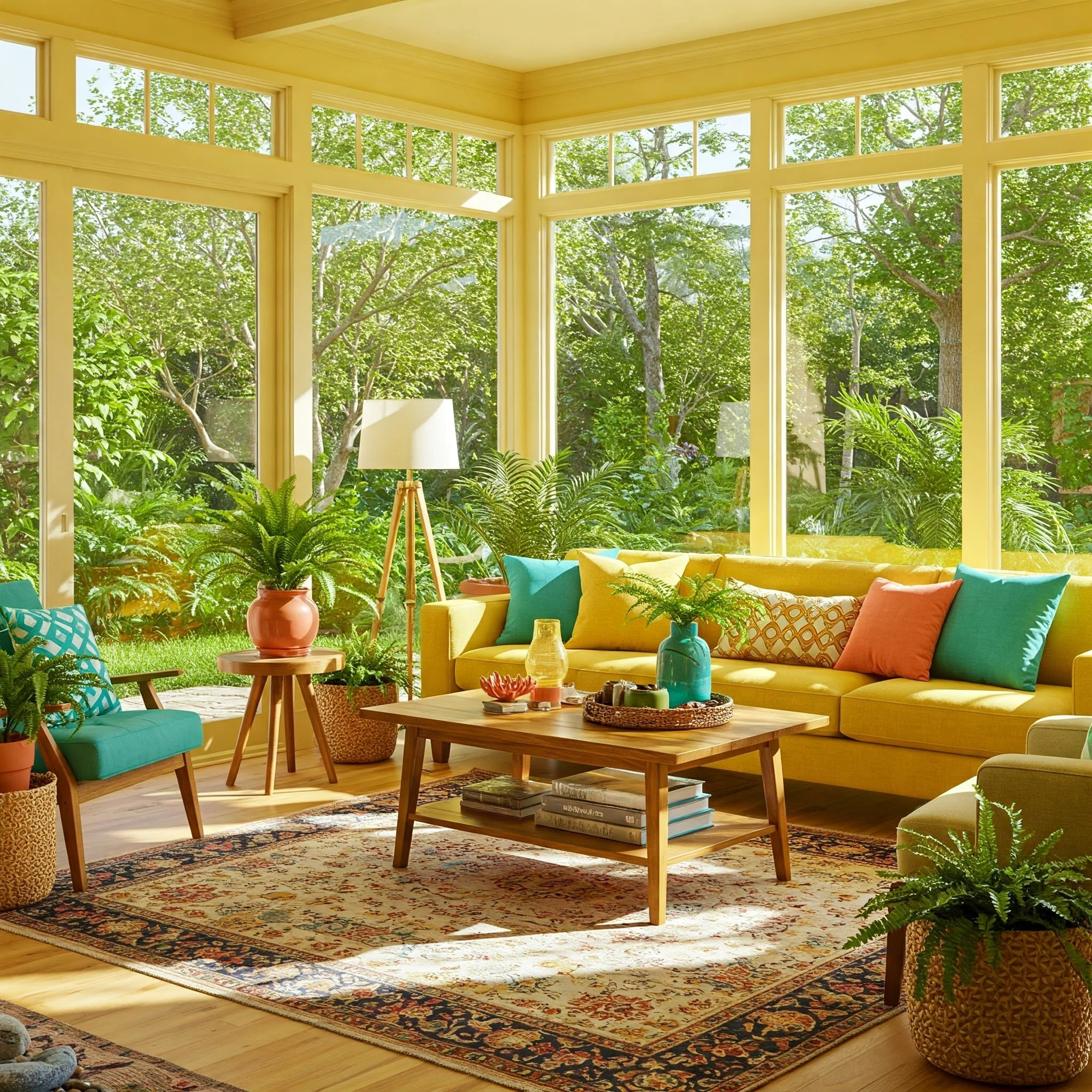 This approach works wonders in sunrooms or any space flooded with natural light. The combination of green plants and yellow accents can lift your spirits—like a refreshing walk in a park, but in the comfort of your own home. Add wooden textures, like rattan chairs or bamboo blinds, and you’ll practically smell the fresh-cut grass.
