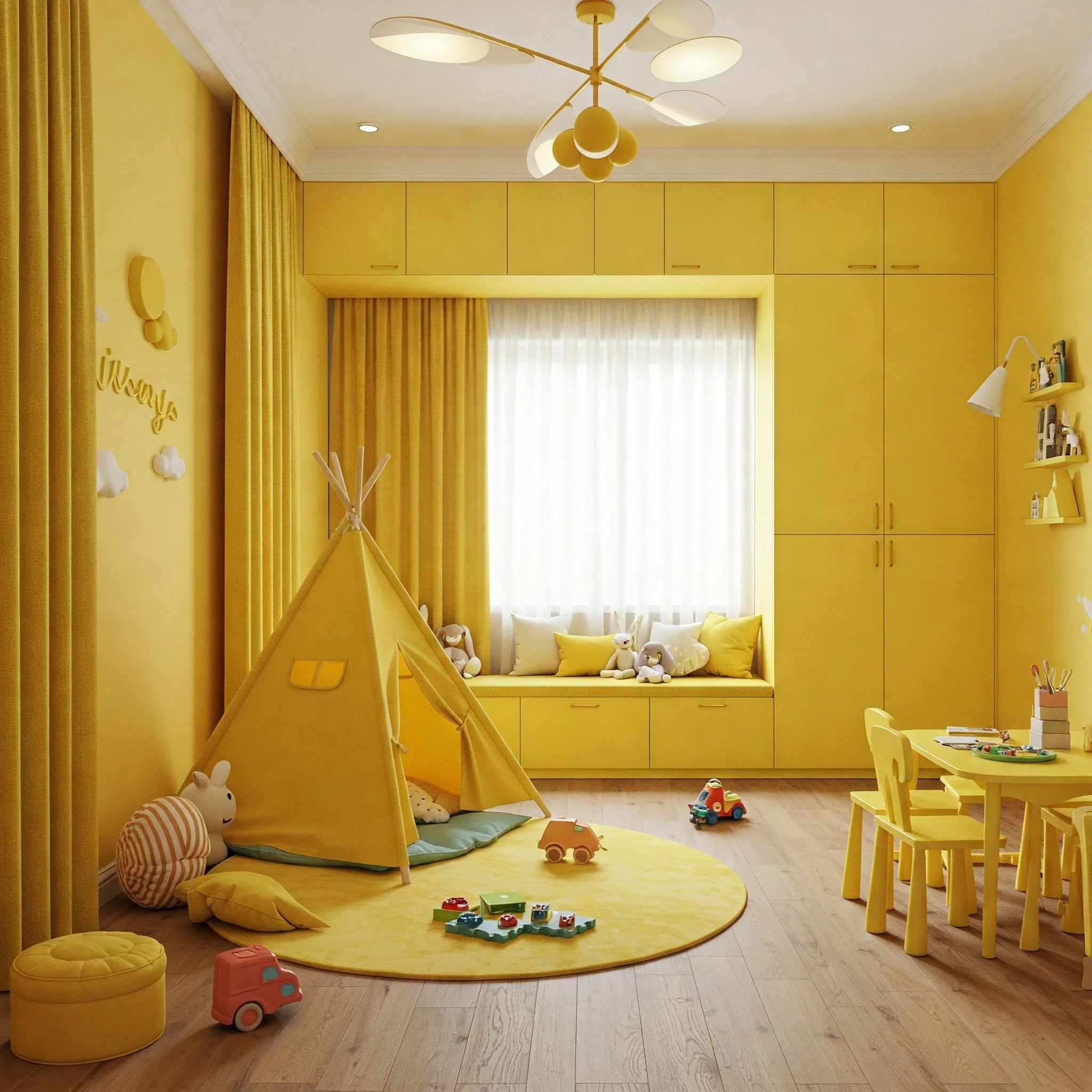 Kids are naturally drawn to cheerful shades, so why not create a kid-friendly yellow room that stimulates imagination and play? Picture a pastel yellow bedroom with a whimsical mural on one wall, playful cartoon prints, or even a bright yellow reading nook. Add fun throw rugs, bean bags, and decorative pillows in coordinating shades to encourage a cozy, interactive environment.