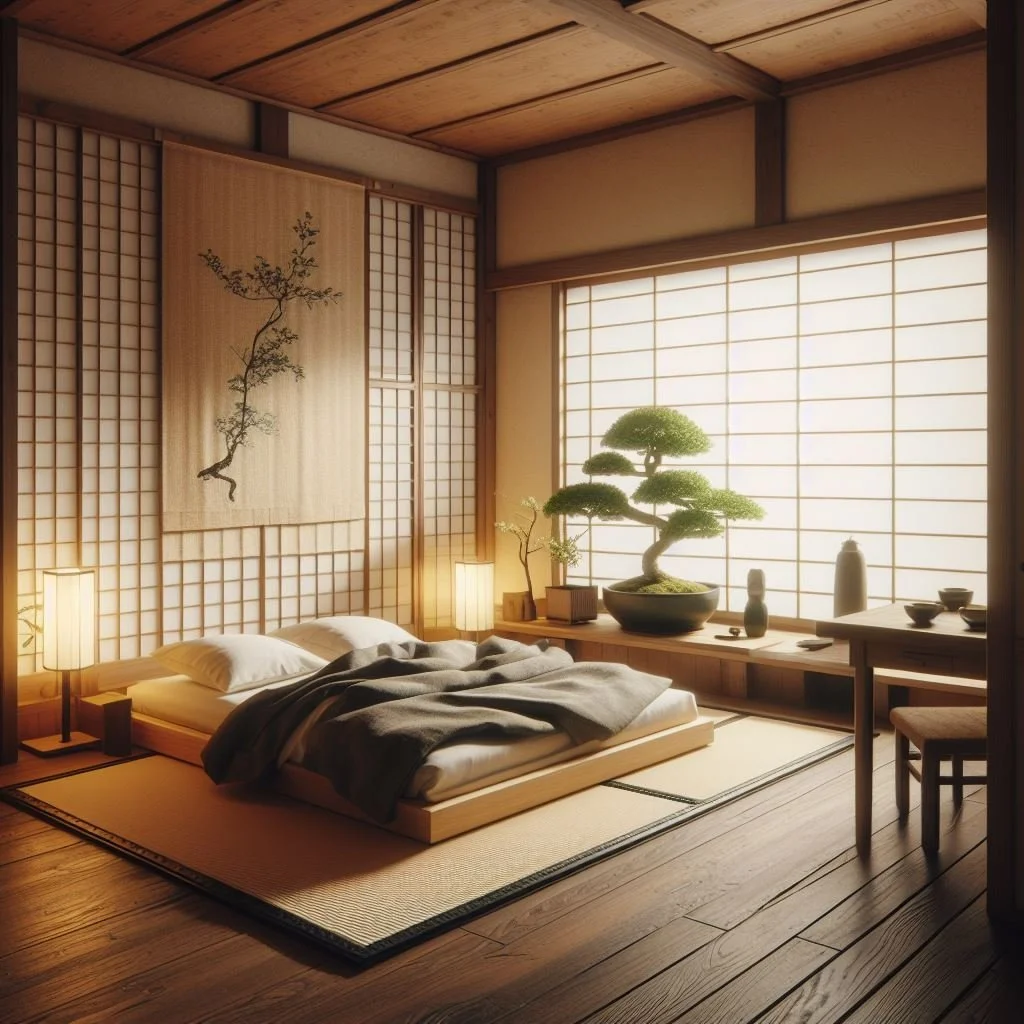 Incorporate tatami mats and floor cushions to create a traditional Zen look. These elements add texture and provide comfortable seating options that encourage relaxation and mindfulness. Use tatami mats as a base for your bed or designate a meditation area to foster tranquility. Floor cushions can be scattered around for informal seating, enhancing the room's inviting and serene ambiance. This setup not only reflects the simplicity and natural aesthetics of Zen design but also creates a versatile space for relaxation, meditation, and mindful living. The combination of tatami mats and floor cushions seamlessly integrates traditional elements into your modern bedroom decor, promoting a peaceful and harmonious environment.