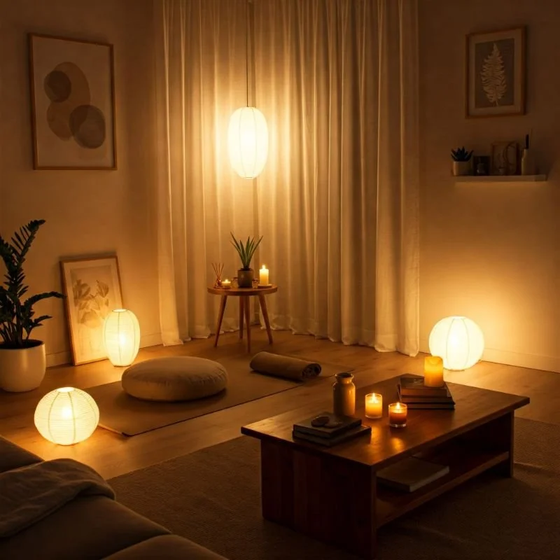 Soft, ambient lighting such as warm LED lights, vintage-inspired lamps, or even candles can create a calming glow in your Zen room. Layering different light sources helps maintain a serene and inviting mood.